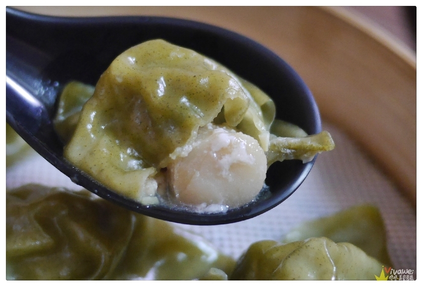 ▲干貝蒸餃的綠色外皮是加了菠菜汁,裡面的干貝是黃金小干貝,一顆蒸餃裡面可以吃到兩顆小干貝或是一顆大干貝。