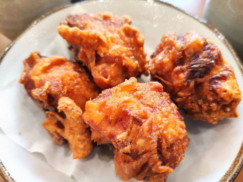 說到烏龍麵一定要搭配炸物的呀,炸蝦又是其中的精華所在——這炸物盤裡頭有蝦兩隻、香菇、青椒、秀珍菇、地瓜,搭配醬汁吃好美味!炸蝦外皮金黃香酥,蝦子甜嫩,炸得很不錯。