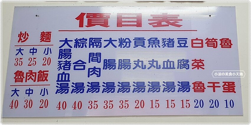 菜單以炒麵、魯肉飯為主,9種口味湯品以及三樣小菜,價格從10~40元,這是正港ㄟ銅板價啦!!