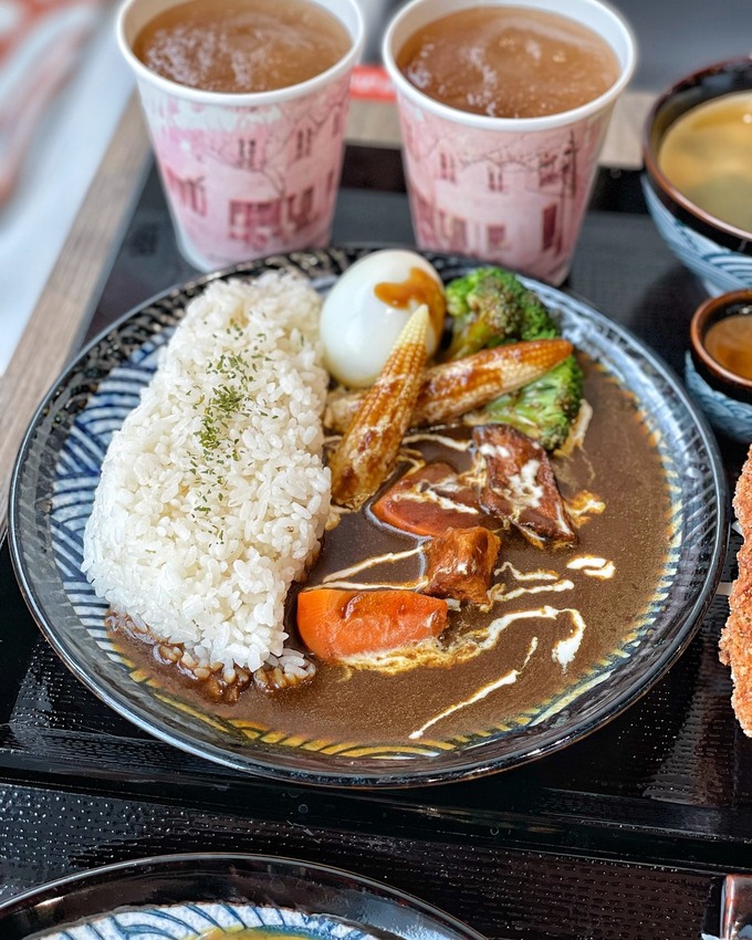 這是我自己把炸物放在咖哩飯上面拍的唷!看起來更豐盛、吸睛!而且咖哩老大還有台灣造型的飯耶!愛台灣~