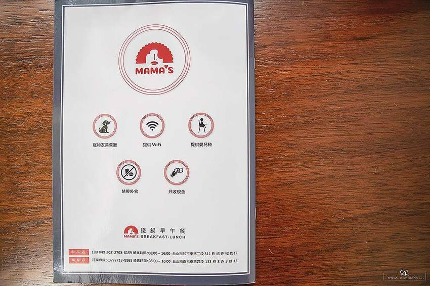 當 Menu 翻到背面的時候,沒想到「MaMa’s 鐵鍋早午餐」是間「寵物友善餐廳」,另外店家也提供免費 WiFi 以及嬰兒座椅,不過結帳時只收現金,不提供刷卡服務唷!
