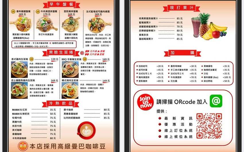 最後附上「MaMa’s 鐵鍋早午餐」的 Menu 給各位參考,可直接點擊 Menu 連結至粉絲專頁的菜單唷!(餐點內容以店家提供的為主)