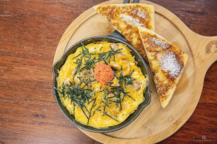 看到「明太子」三個字就想要點來品嚐看看,沒想到也是個人非常推薦的一道餐點。自製調味烘烤出的溫體雞腿肉搭配紫洋蔥丁、明太子、海苔細絲、綜合乳酪絲、紅仁蛋及一旁的法式吐司。入口後雖然明太子的味道重了點,但卻有軟嫩的雞腿肉讓人非常喜歡,再將法式吐司送入口中只能說這樣的組合非常搭也不會覺得太膩。若是蛋控的朋友們,可以考慮一下試試看這道餐點唷!