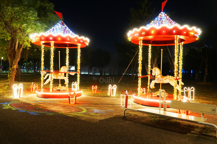 ▲ 走到隧道的盡頭,會看到紅色的旋轉木馬,不過木馬並沒有轉動喔!地面上有投影不停轉動的七彩炫麗摩天輪,歡樂耶誕氣息展露無遺。