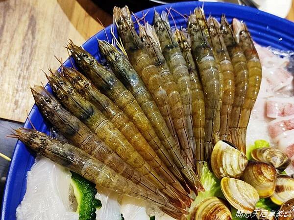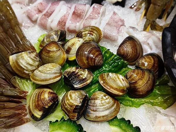 超大圓盆擺了10種海鮮食材:大白蝦、小白蝦、海鮮滑、虱目魚滑、鮮蚵、透抽、蛤蜊、巴沙魚片、小花枝、鯛魚片與雪花牛腹肉(氣冷雞/活力梅花豬/雪花牛腹肉3選1)