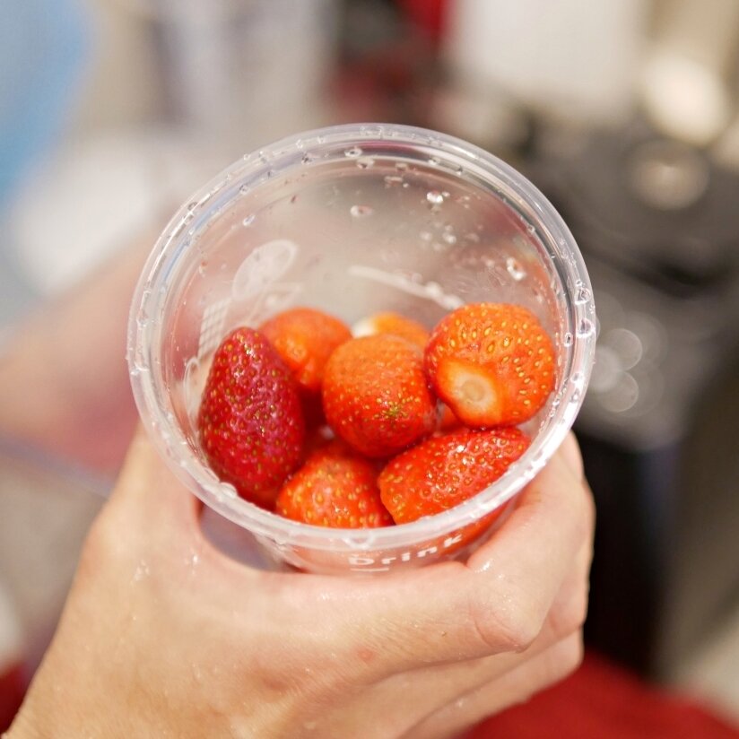 像期間限定的 粒粒草莓奶霜 就是在顧客點餐之後,才現場使用新鮮草莓打製,從櫃檯都能看得到製作過程,讓大家在開心喝手搖飲的同時也能更放心、安心。