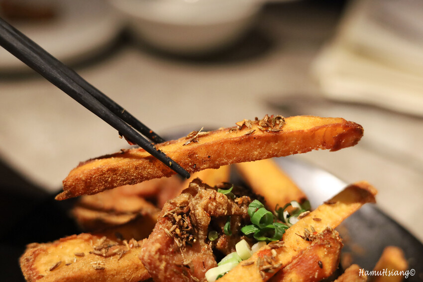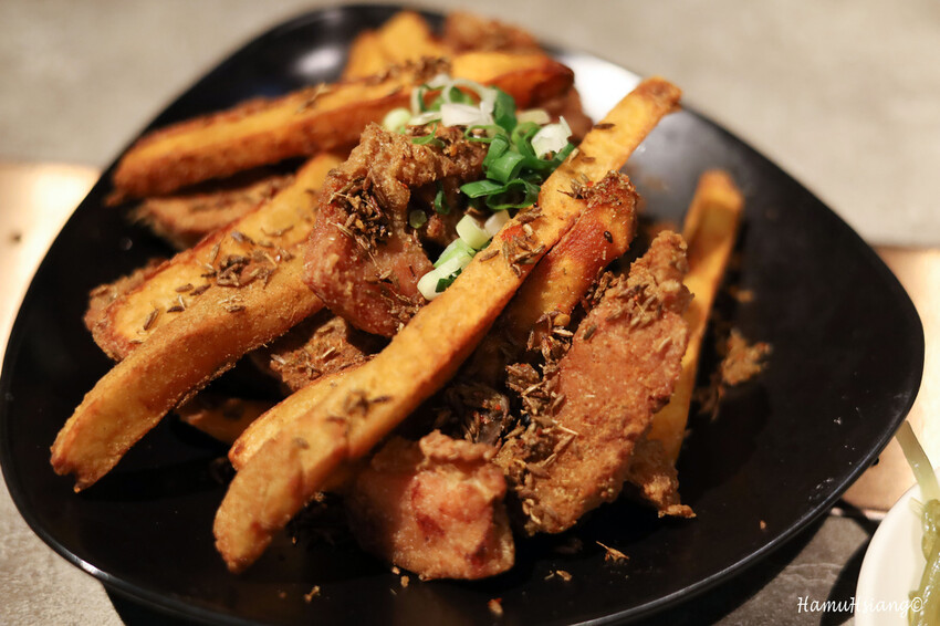 這道你可以聞到很香的孜然味,還附上地瓜薯條讓你開胃.炸的很酥脆,不會很死鹹有孜然的香味
