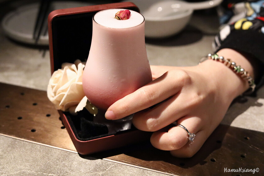 超漂亮的一杯調酒,放在戒指盒裡還附上戒指很適合拿來求婚🤣