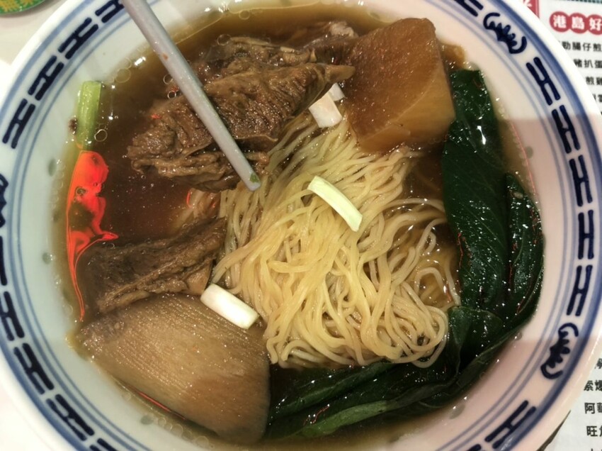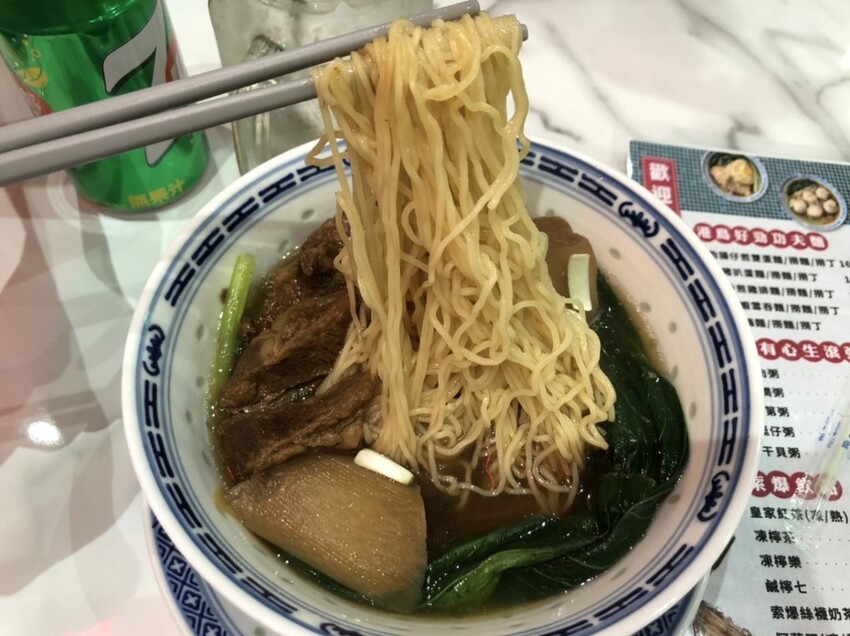 元朗牛腩麵,一樣是飽滿的麵體搭配軟嫩入口的牛肉塊與配菜很滿足!湯頭是以大骨熬許久煲出鮮甜口感,牛腩軟嫩入味