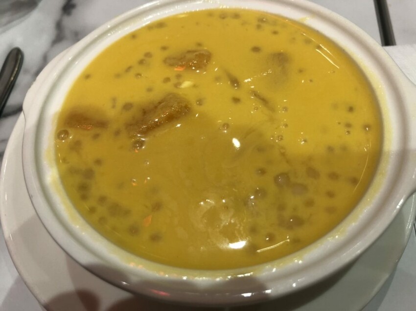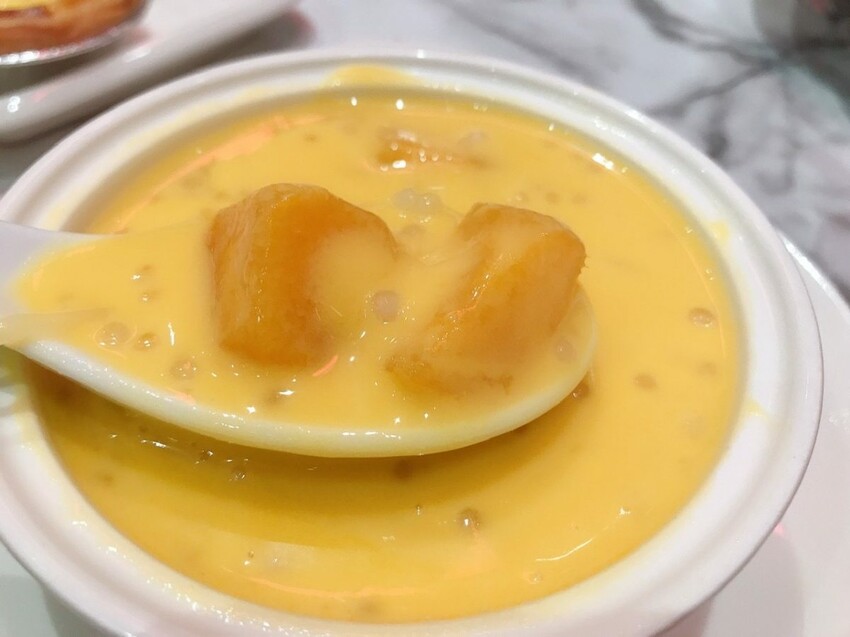 楊枝甘露,新鮮芒果製成芒果甜品,搭配增添口感的芒果丁、西米露,清涼消暑
