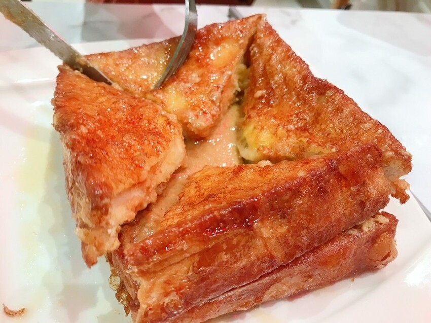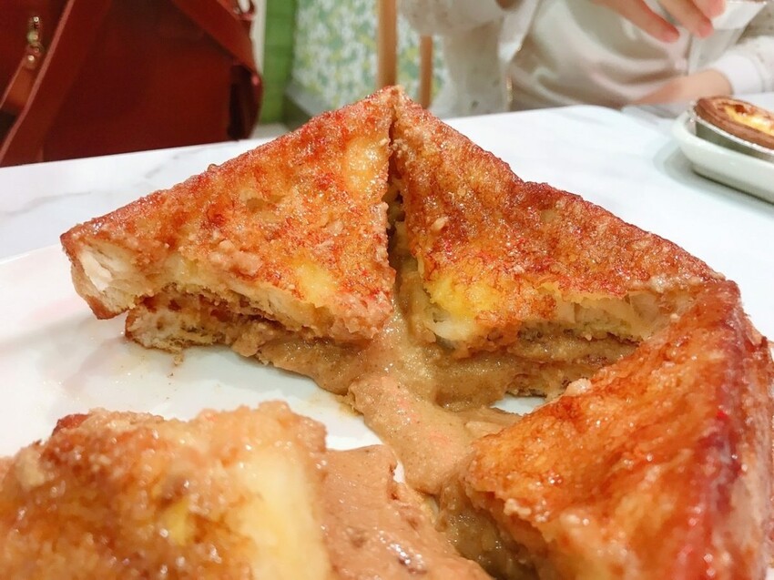 熔岩花生西多士,每咬一口都爆漿,趁熱吃,雖然很罪惡,但是超好吃!主廚自製的花生醬汁滲透厚片吐司,口中滿是RICH的滋味