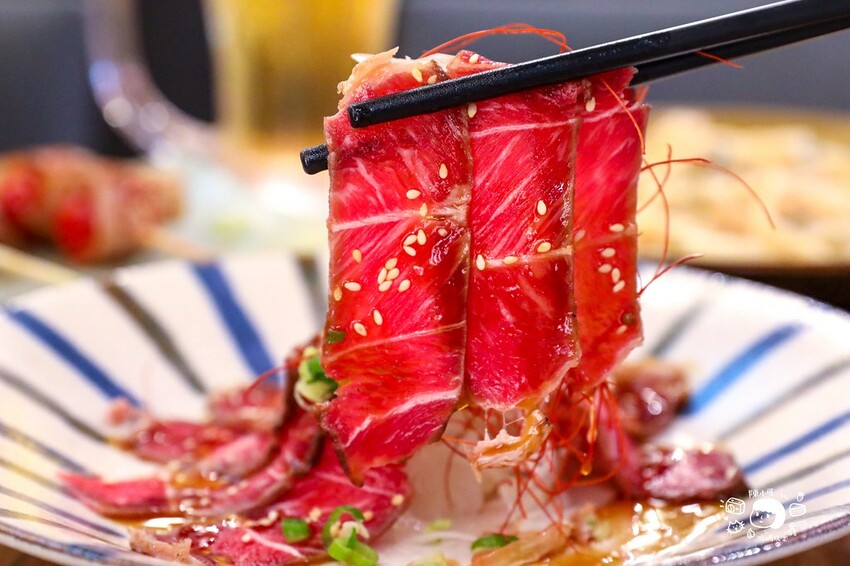 切成薄片的生牛肉,沾著底下的和風醬油,細緻甜美的肉質,味道很不錯,搭配辣椒絲、青蔥和洋蔥,清爽帶點辛辣很適合小酌的搭配。