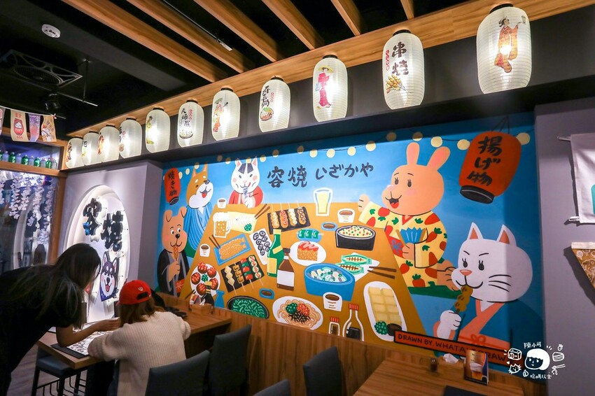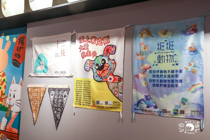 容燒居酒屋有很多可愛的寵物元素,我選在牆上很多動物吃燒烤的座位,色彩繽紛超可愛。