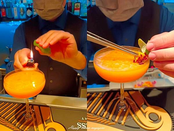 bartender 以火炙燒一下檸檬皮,釋放出更多的檸檬香氣,再點綴於杯緣