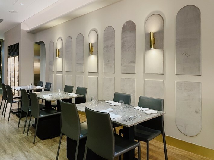 餐廳入口做了一個很寬敞的前院,並將內部迎賓櫃台做成像溫室一樣的透明玻璃屋,可以想像白天來用餐光線一定很美.