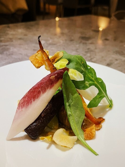 以紅酒跟蘋果醋燉煮的牛頰十分柔軟,但香氣不足,也沒有入味.反倒是旁邊的醬泥讓我很驚訝.主廚將紅蘿蔔外層青澀去除,只使用最中心最甜的部分與焦化奶油一起製作成泥.這樣的做法的確去除了紅蘿蔔討厭的味道,保有一些類似番薯和南瓜的味道.