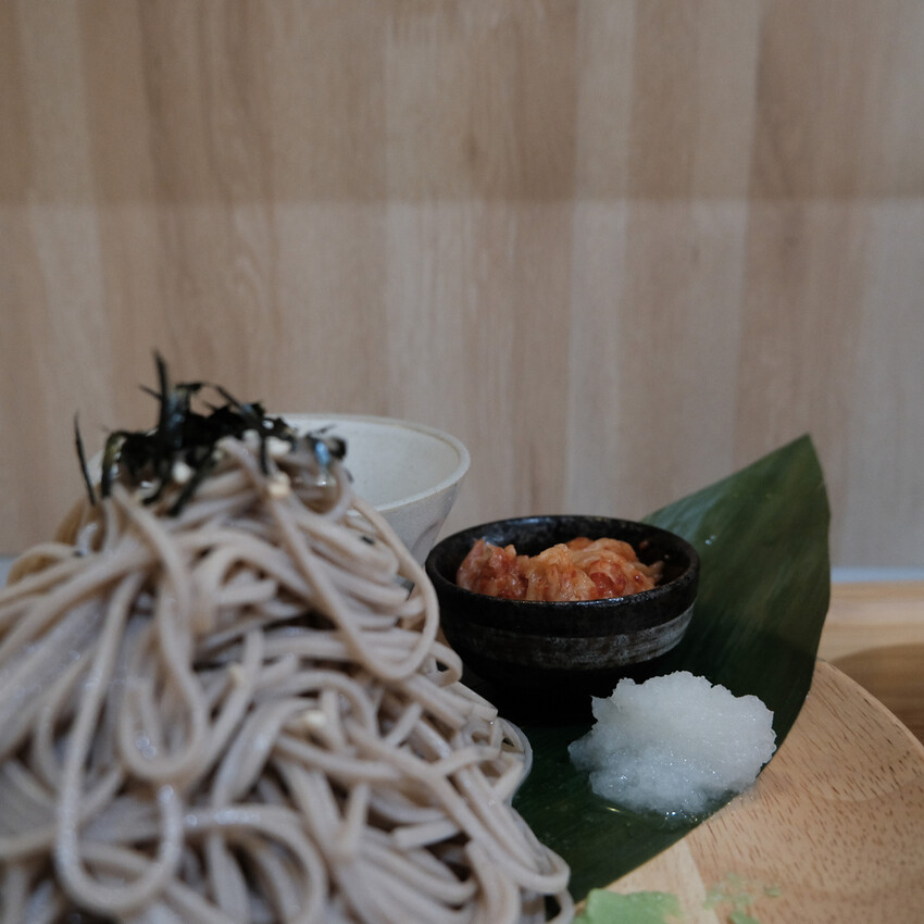 彈牙的麵條沾附嗆辣芥末、爽口蘿蔔泥