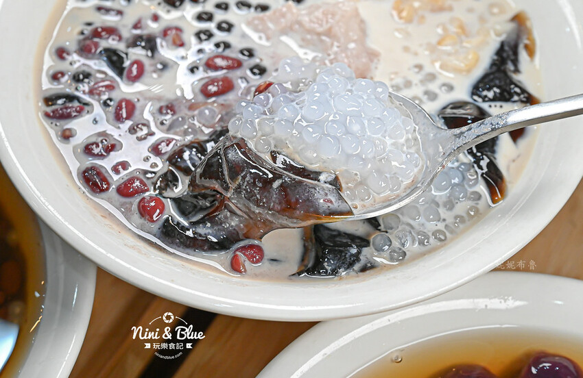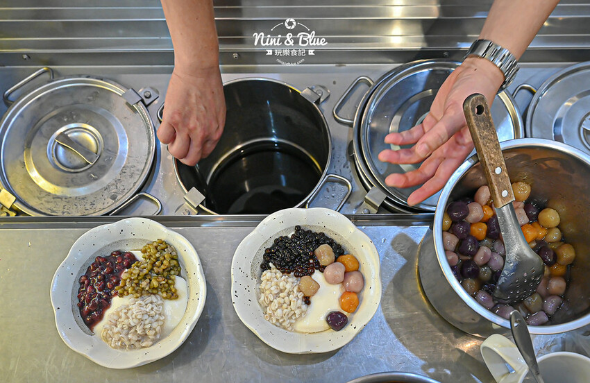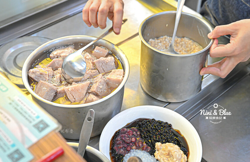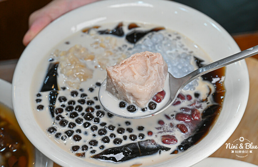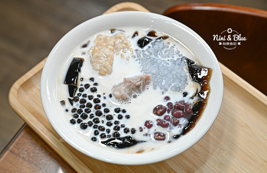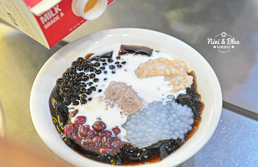 我們選的是招牌鮮奶嫩仙草2號,以嫩仙草為主角,配料有芋頭、紅豆、粉圓、西米露、燕麥,搭配純鮮奶和一點甜湯,妮妮布魯平常不愛吃甜的,所以請店家不加糖水。