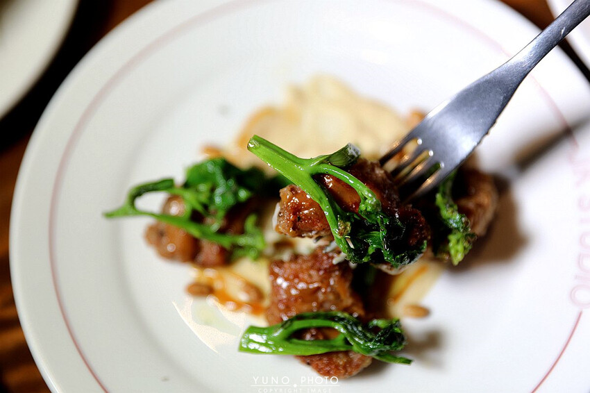 主廚將小牛胸腺煎至金黃酥脆 保留其內部的嫩滑口感 同時增添外層的脆感 吃起來相當美味