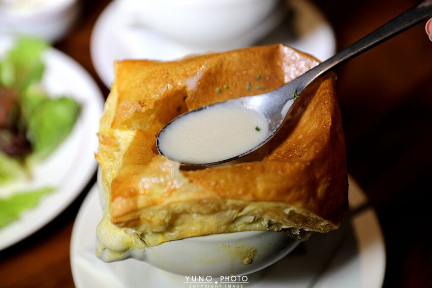 每一口都是香濃與細柔的極致享受覆蓋在濃湯上的酥皮烤得金黃酥脆