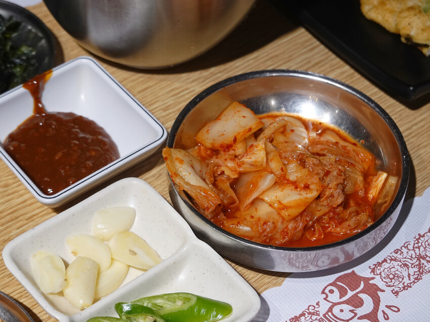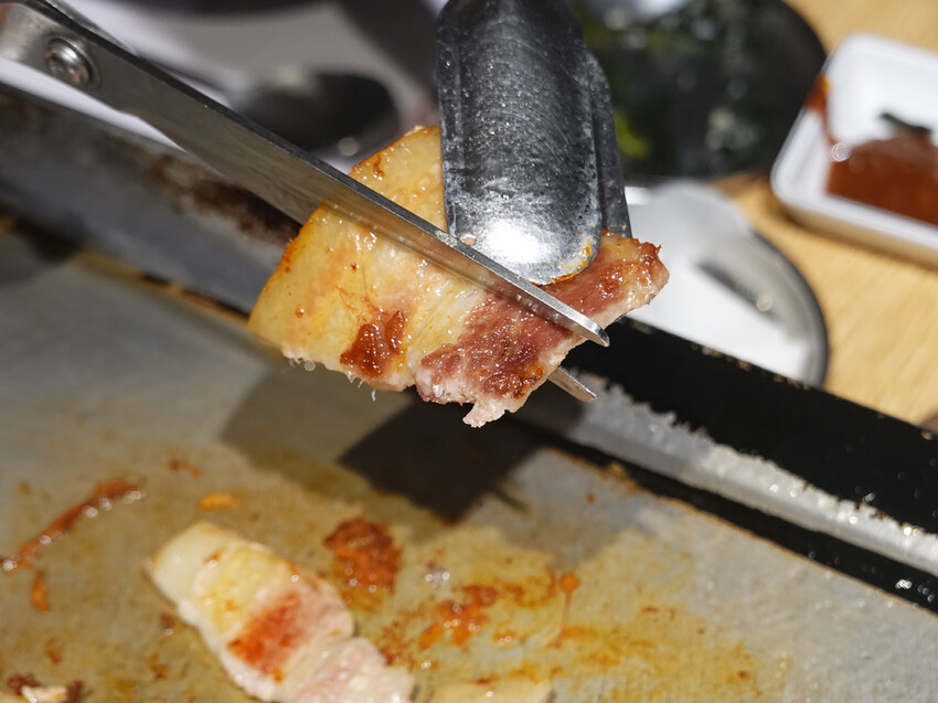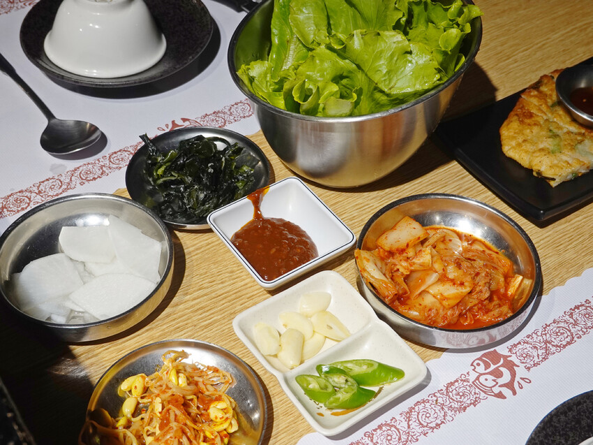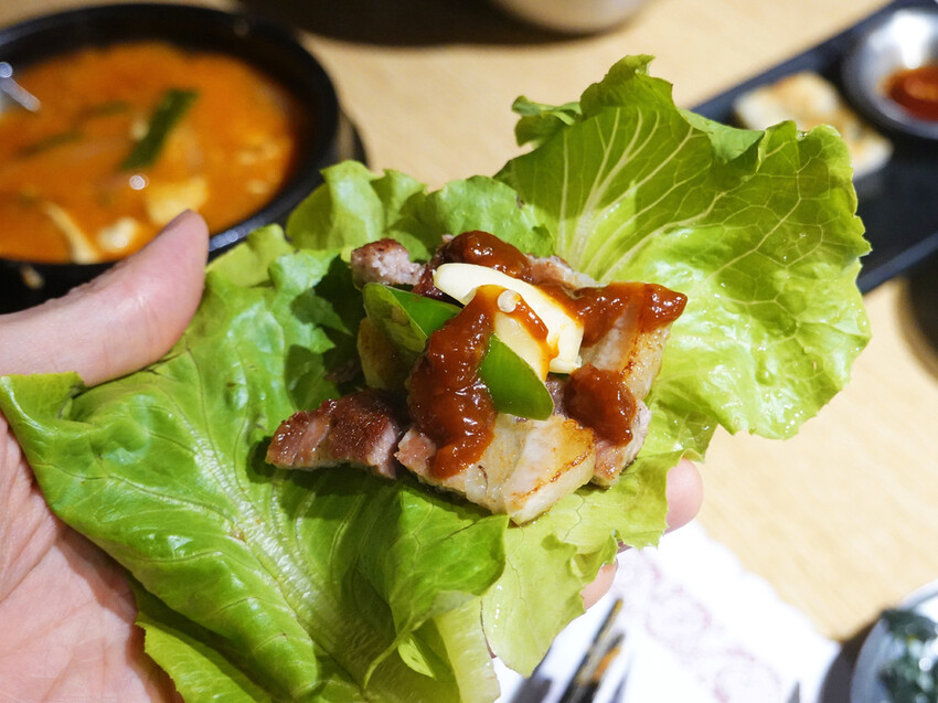 烤肉是這裡的重頭戲,建議從原味豬五花開始品嘗,肥瘦相間的肉片在鐵盤上發出誘人聲響,煎至雙面金黃後剪成條狀,單吃毫無腥味,口感更是酥嫩結合。包進生菜,加上蒜片、青辣椒片、泡菜及韓式沾醬,一大口咬下去,滿足感直接爆棚!