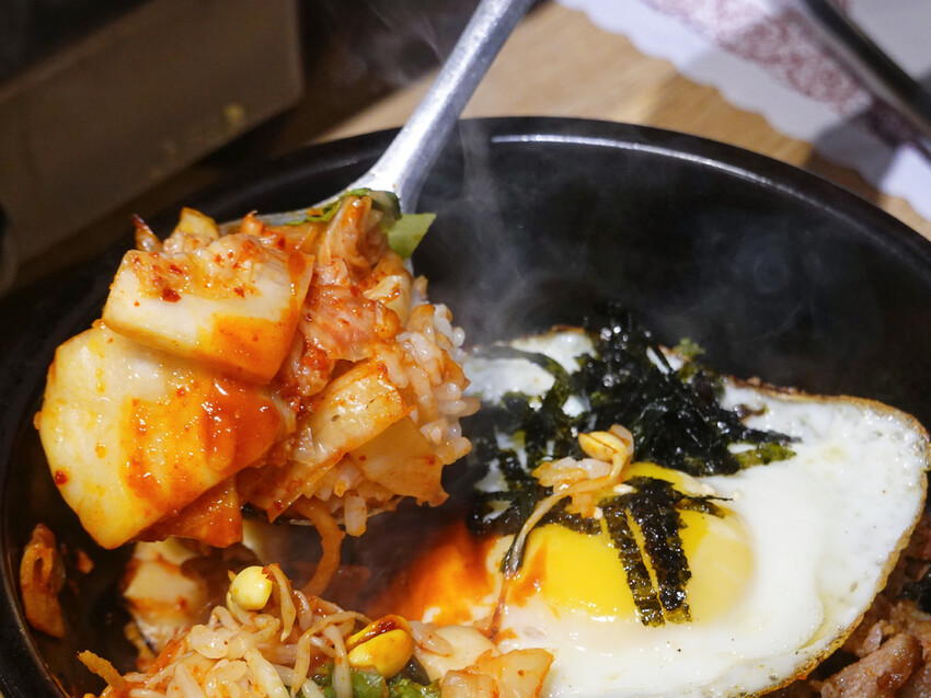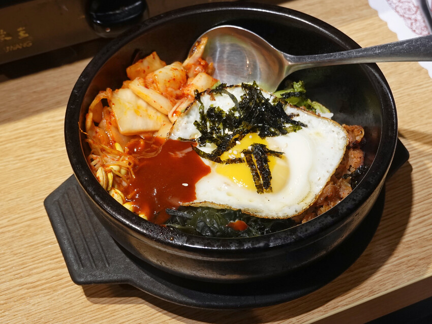拌飯端上桌時熱騰騰的,蛋黃在石鍋裡滋滋作響,混合著各種蔬菜和醬料,拌勻後每一口都充滿韓式風味,建議2~3人一起吃。