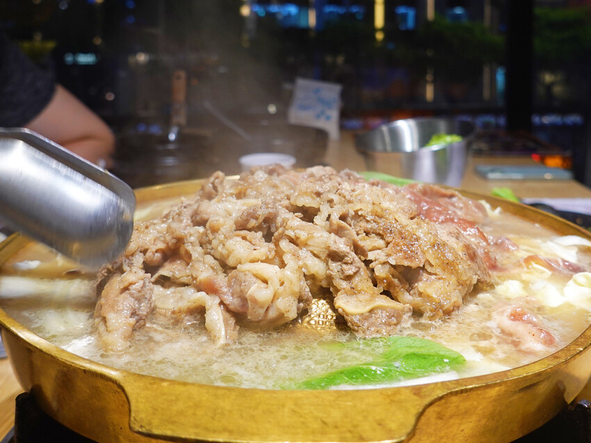 銅盤加熱快速,肉片炒熟後的肉汁流進高湯,建議搭配高麗菜一起煮,湯底更加香甜濃郁。
