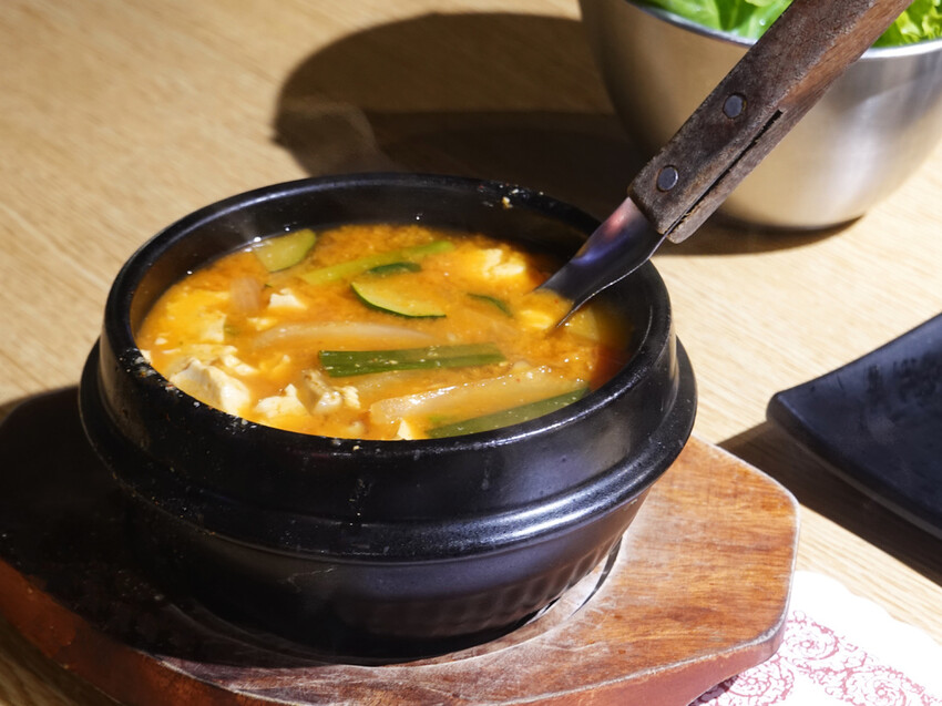 熱愛韓國湯鍋的朋友有福了,這裡有泡菜辣湯、海鮮豆腐湯、部隊鍋和大醬湯可選。我點了韓國味噌湯版的大醬湯,濃郁中帶點辣味,裡面還有豆腐、洋蔥和櫛瓜等豐富配料,喝完真的是暖胃又滿足。