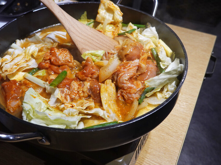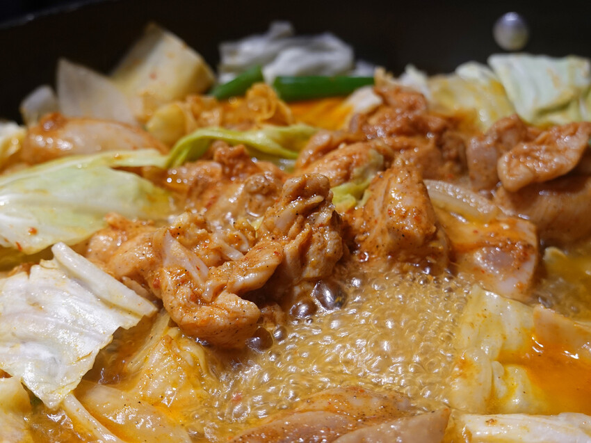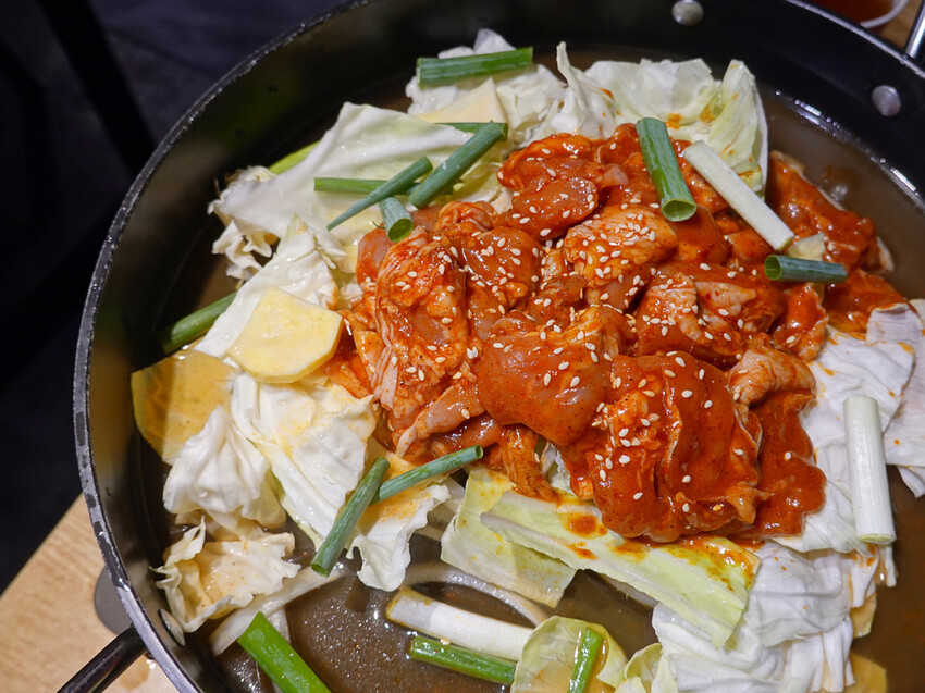 就算肚子已經飽得不行,也絕對不能錯過春川辣炒雞!雞腿肉帶皮煎炒,醬汁充分滲透,鹹甜交織的口感不僅下飯,辣度還恰到好處。不妨加點洋蔥,增添層次同時也解膩。