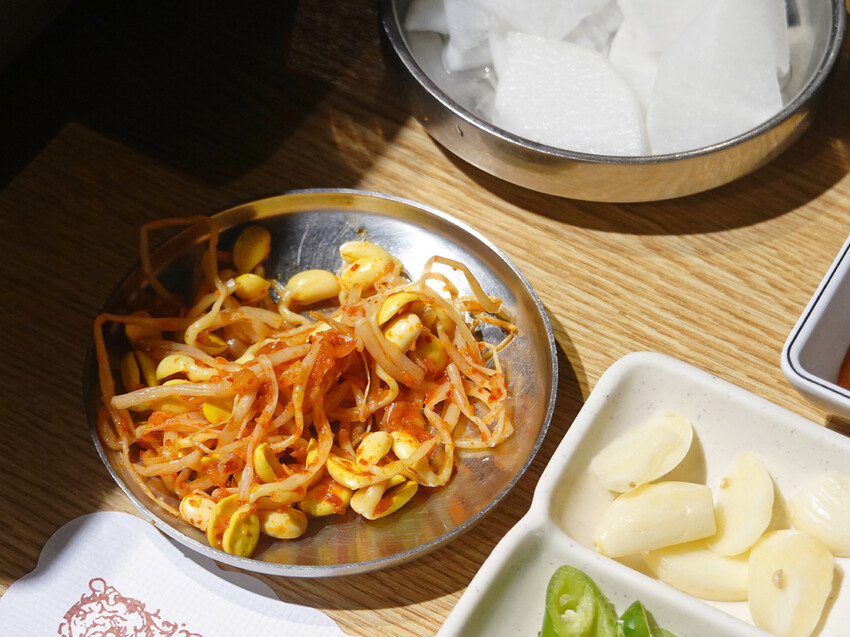 韓式餐廳怎麼少得了小菜?這裡的小菜包含黃豆芽、泡菜、醃漬白蘿蔔和海帶。