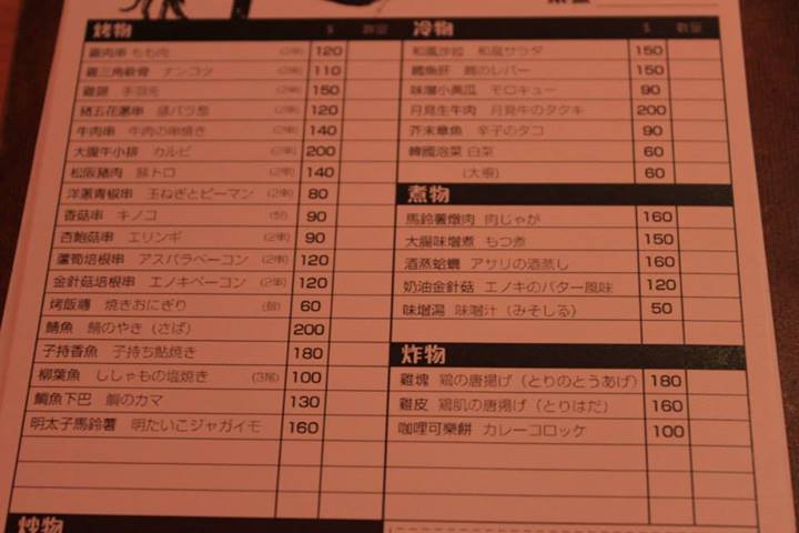 烤物、炒物、冷物、煮物、炸物。
