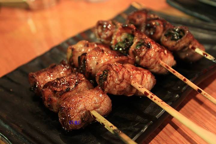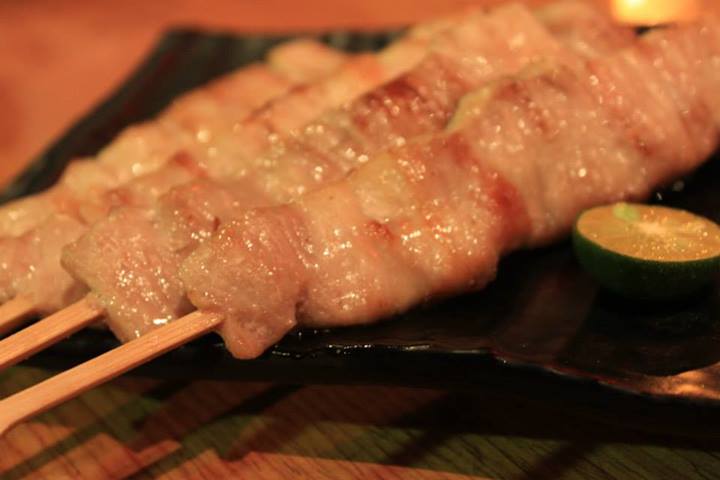 雞皮、明太子馬鈴薯、牛肉串、松阪豬肉、雞肉串。