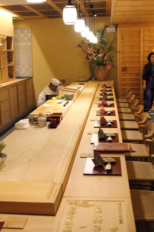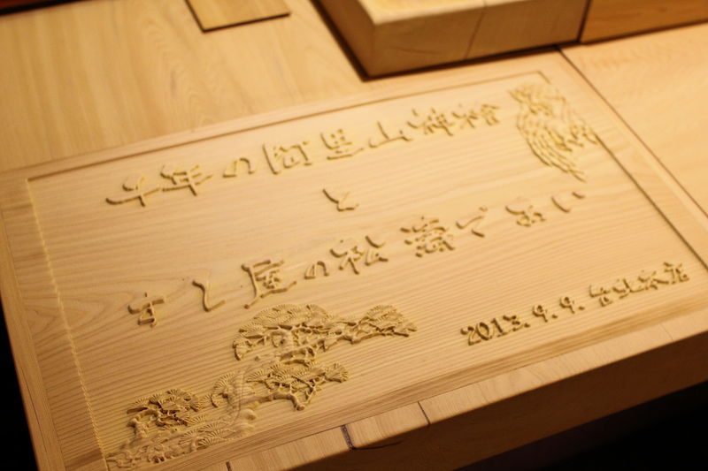 甫進入餐廳,撲面而來的是濃濃的檜木香氣。松濤鮨的板前使用台灣阿里山的千年檜木,可謂是大成本,板上還刻了這塊木頭是2013.9.9製,跟我生日同天。