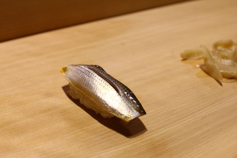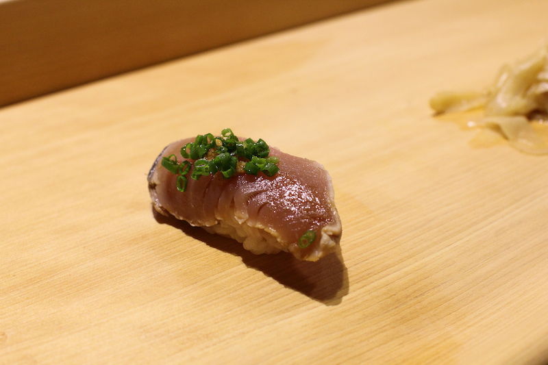 接下來這貫也是鮪魚,不過用的是僅有六公斤左右的小鮪魚,數量比較稀少。小鮪魚搭配細蔥,初味自然是細蔥的辛辣,魚肉口感非常柔軟鮮膩,中味浮現薑的辛辣,尾韻則淡淡的甜味與微酸。