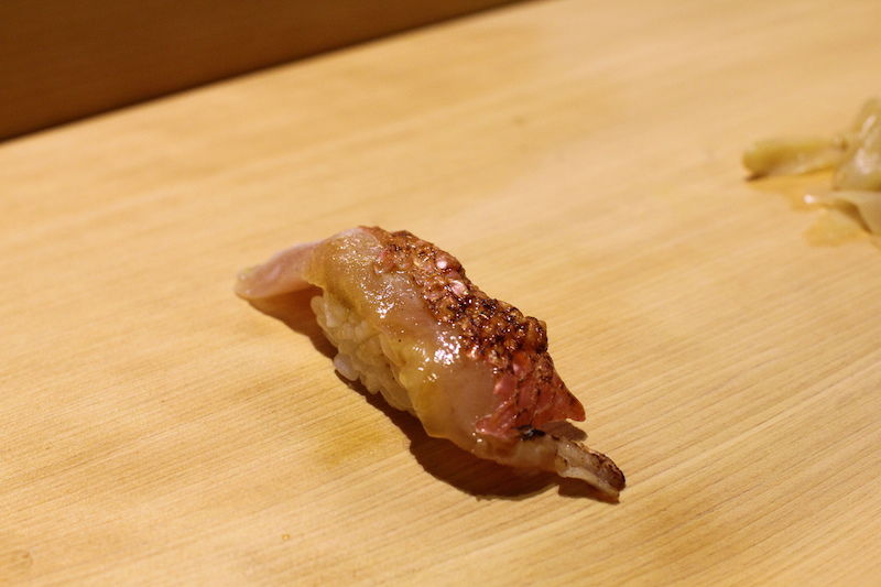 第二貫則是真鯛,柚子醬油調味,頗有彈性,帶著柚香與淡淡的甜味。吃了第一貫的中腹肉後,再吃這一貫便稍覺清淡了點。