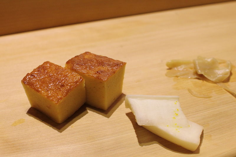 師傅招待的鱈魚白子,做成像豆腐的模樣,口感彈嫩,滋味卻是十分清淡,有點像豆腐。