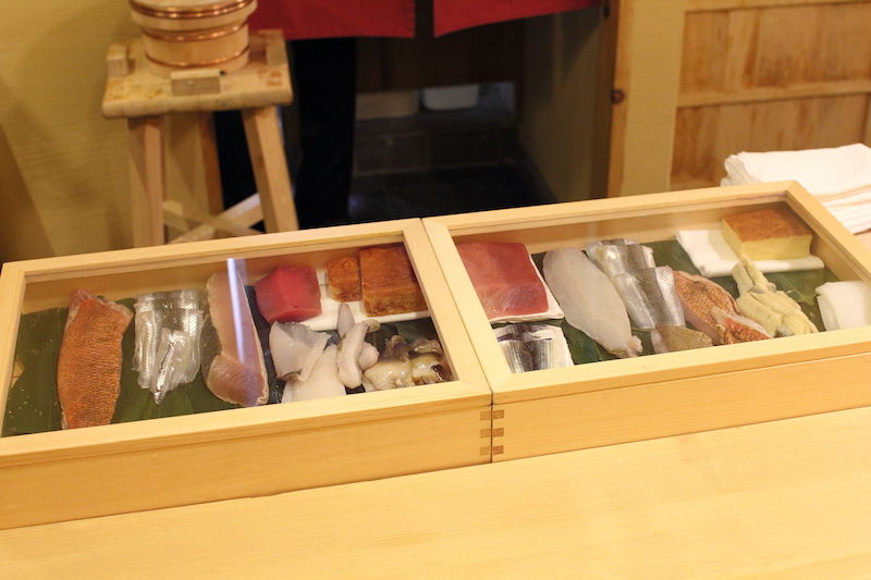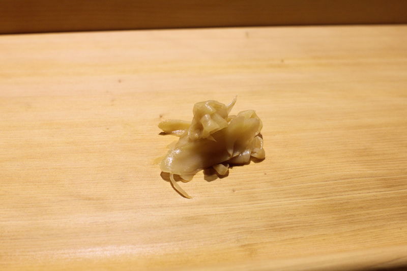 握壽司的部份直接放在檜木板前上,師傅會隨時拿布擦拭,保持板前的乾淨。首先放上吃壽司必有的薑片,松濤鮨的薑片微酸偏辣。