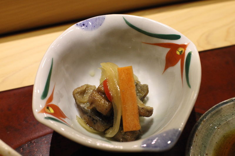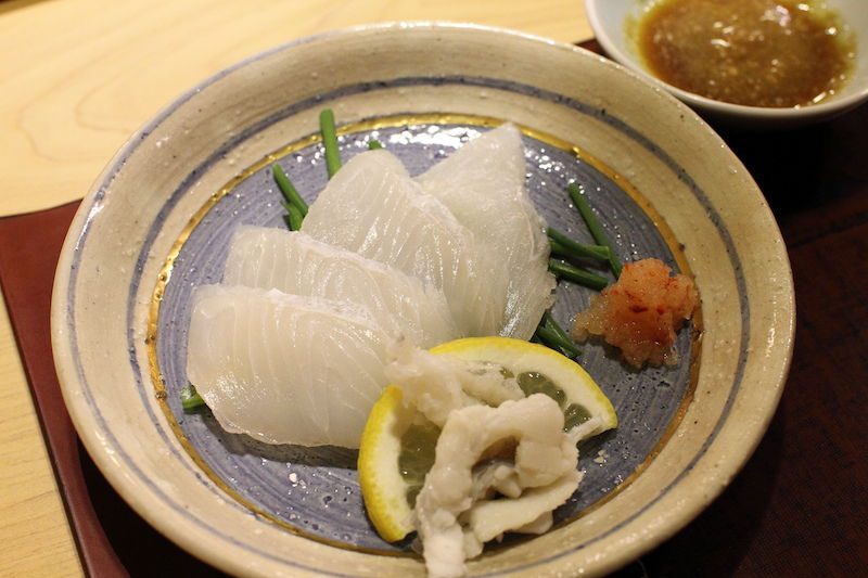 第一道是刺身,送上的是剝皮魚與魚肝搭配辣蘿蔔泥。剝皮魚富有彈性,口味清甜,可搭配一旁的魚肝一起食用。魚肝倒不是一般常見的軟膩口感,而是帶點筋道。