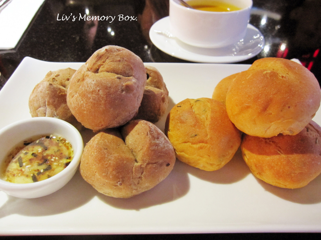 餐前麵包,左半邊為核桃麵包,右半邊則是迷迭香麵包。