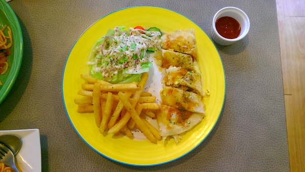 手工蛋餅系列都會附薯條與沙拉