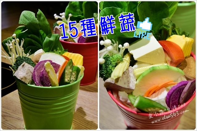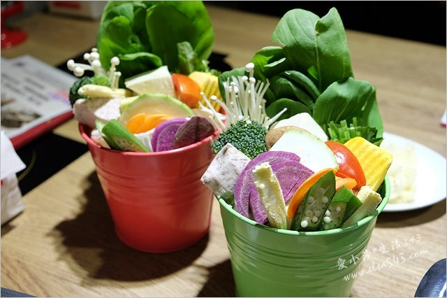 每份套餐皆附菜盤,用可愛的彩色鐵桶盛裝的菜盤就彷彿是個花藝品,裡面共有15樣當令食材(依季節更換),這天看到有秋葵和紫地瓜,這在火鍋菜盤中算是少見呢!