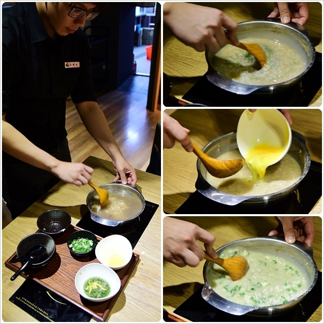 基本的蝦膏,再加上一碗白飯(可煮出四碗)、蛋、蔥, 還有店員細心耐心愛心的攪拌,一步一步的就完成美味的海鮮粥囉!