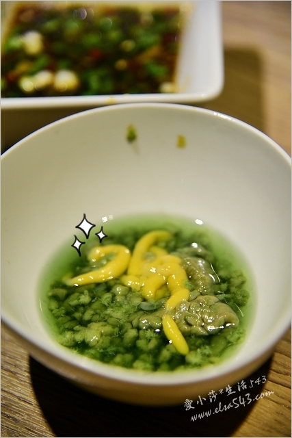 另外還附上的這疊鵝黃色醬汁是用來沾肉的胡麻醬蛋汁,肉片沾附後口感變的很滑順,還有芝麻的香氣,超棒的!我第一次吃到有加蛋汁的(之前只遇過純胡麻醬)超令人驚喜~~