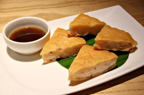 將鮭魚下巴切半後酥炸搭配使用綠辣椒、香茅、椰糖與檸檬汁製成的酸辣中帶點甜度的海鮮醬,口感酥脆不會油膩,可我吃的那塊正好都是魚鰭與骨較多,肉量不多,比較適合愛吃"口感"而非愛吃魚肉的客群,但不知其他塊是否如此。