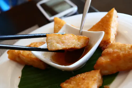 此月亮蝦餅很厚,炸的酥脆不油膩,裡頭的花枝漿與蝦泥中還吃的到點蝦肉,而因為花枝漿比例較高所以口感較為紮實、帶點Q感。
