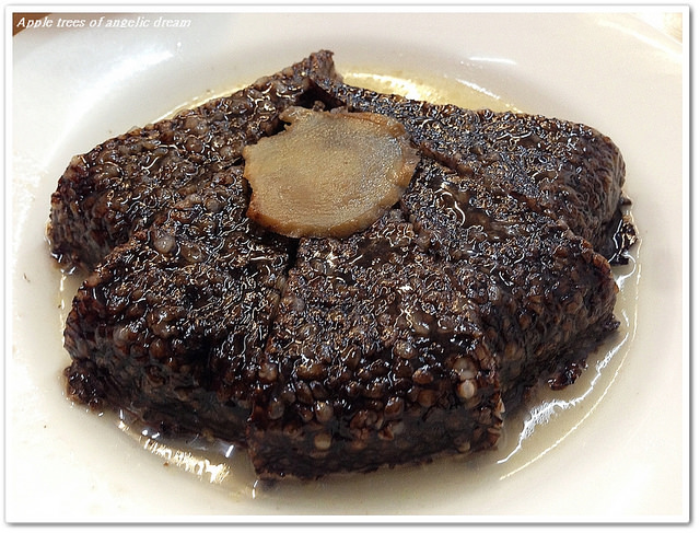他們家的米血糕是圓型的,有麻油和薑片酒香吃起來口感不會過爛略帶Q度還不錯