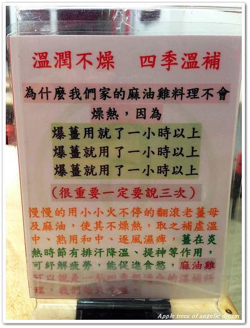 他們家的麻油料理強調溫潤不燥四季溫補,至於為什麼桌上牌子有介紹很重要所以說三次