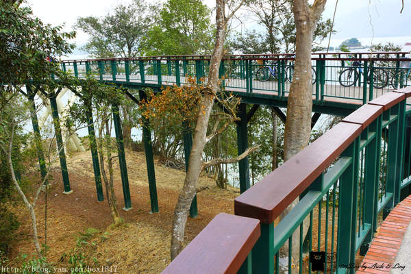 腳踏車停靠在景觀台旁,走到懸臂式景觀台欣賞日月潭美景,