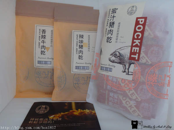 這次體驗了榛紀肉舖子的蜜汁豬肉乾隨手包,辣味豬肉乾和香辣牛肉乾,