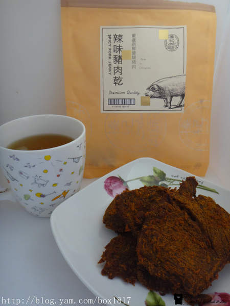 辣味豬肉乾,肉質部份較鮮嫩、有彈性,吃起來有咬勁,